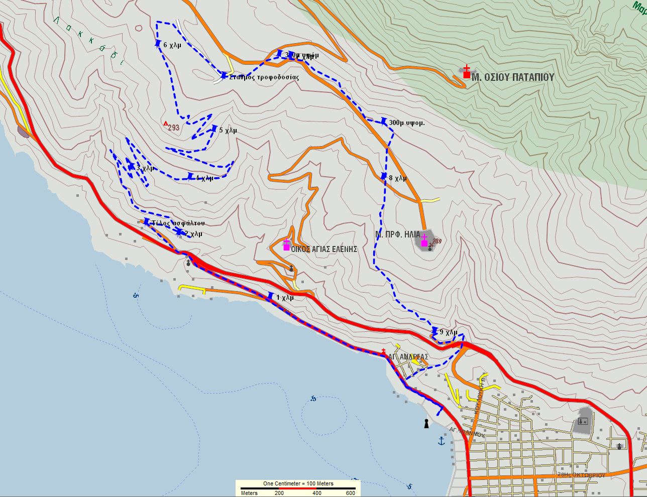 Μπαίνουμε στην τελική ευθεία! Ευθεία, βέβαια, δεν τη λες, αλλά σχεδόν τελειώσαμε! Φτάνοντας στη μονή του Οσίου Παταπίου μπαίνουμε σε νέο τμήμα της διαδρομής παρακάμπτοντας έτσι το μοναστήρι και καταργώντας 500 μέτρα ασφάλτινης διαδρομής, για να κατηφορίσουμε στο παλιό μονοπάτι, βρίσκουμε χωματόδρομο, πάλι μονοπάτι και τρέχοντας τα τελευταία 400μ. σε άσφαλτο φτάνουνε πάλι στη θάλασσα, όπου και ο τερματισμός.